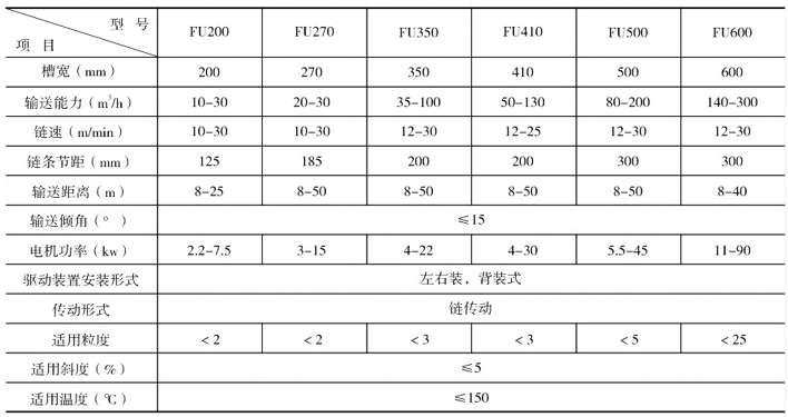 ·FU系列刮板輸送機(jī)廣泛運(yùn)用于堆積密度<l.6t/m3,磨琢性較強(qiáng),粉、粒、小塊狀物料的水平、小傾角(≤50)連續(xù)輸送,如煤粉、碎煤、水泥、粉煤灰、焦粉、焦粒、礦粉、化肥、糧食等大輸送量(≤600t/h)、長距離(<60m)、較高溫度(<150℃)物料的連續(xù)輸送。